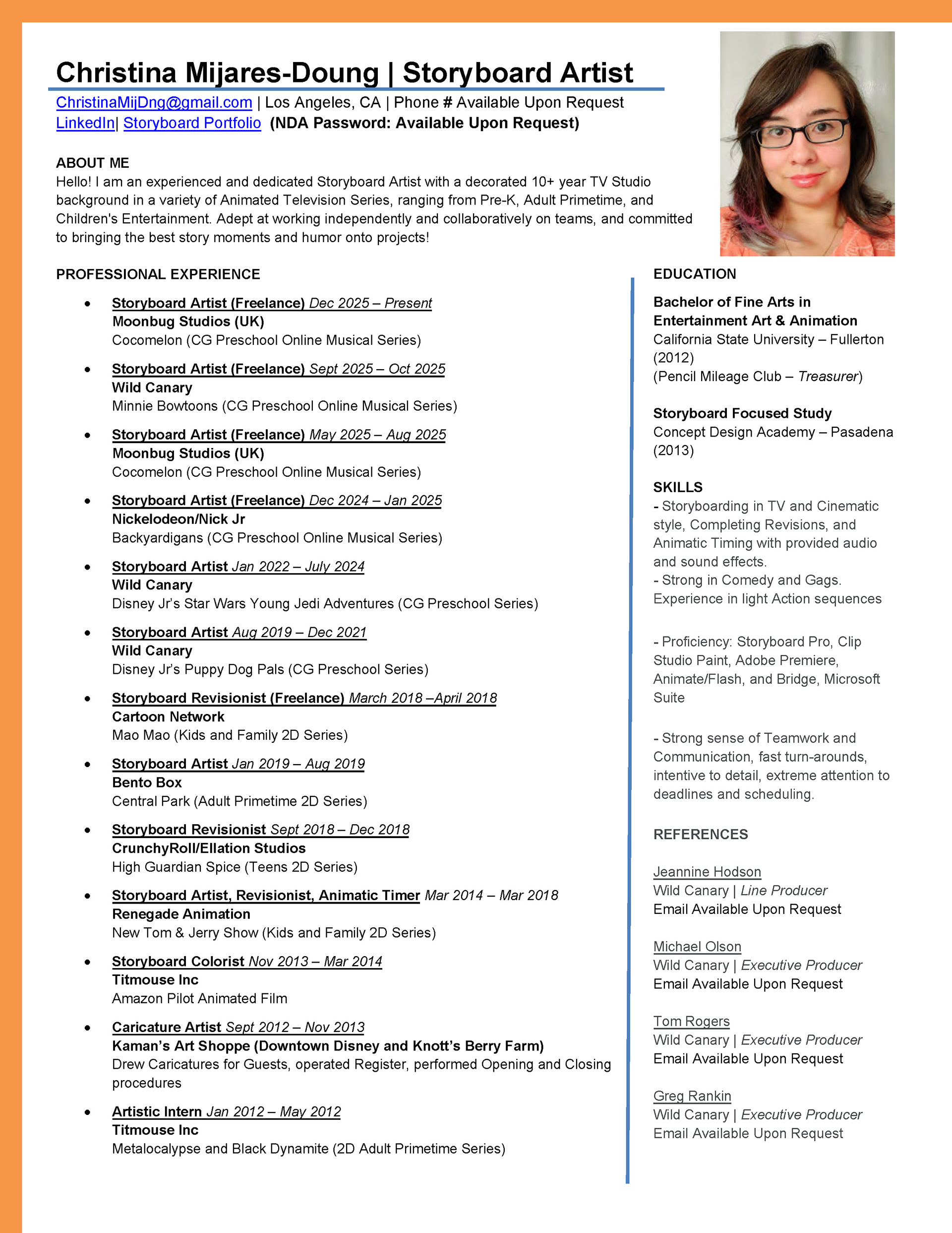 Hello! I'm Christina Mijares-Doung, an LA-based Storyboard Artist with 10 years of Studio experience. I've worked on award-winning shows, such as Disney Jr's Young Jedi Adventures and Apple TV's Central Park. I'm proficient in Storyboard Pro, Animatic Editing, and Clip Studio Paint. When I'm not drawing, I'm busy practicing my Ocarina, learning cooking recipes with my Husband, and chasing after my two cats around the house!